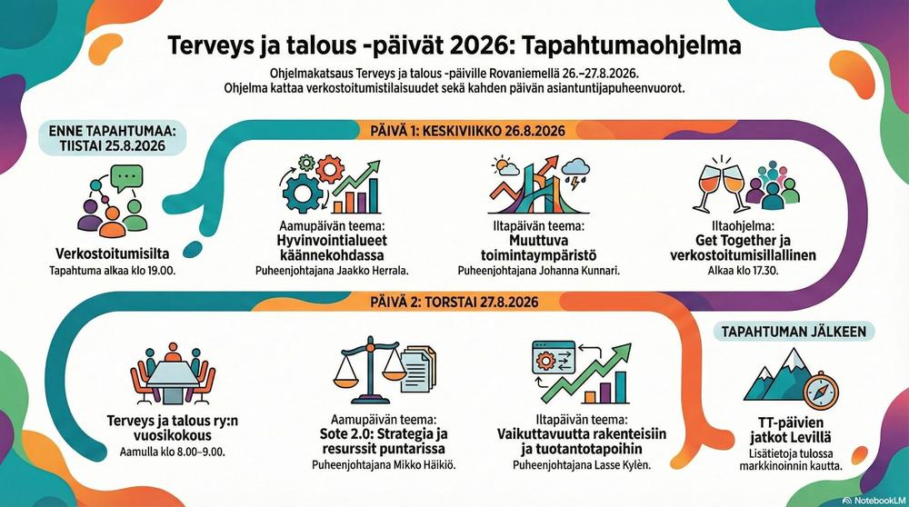 Terveys ja talous -päivät kokoavat jälleen alan parhaat asiantuntijat, päättäjät ja kehittäjät Lapin sydämeen, Rovaniemelle. Tapahtuma järjestetään Santa’s Hotel Santa Clausissa, ja luvassa on kaksi täyttä päivää ajankohtaista asiaa, verkostoitumista ja Lapin elämyksiä.